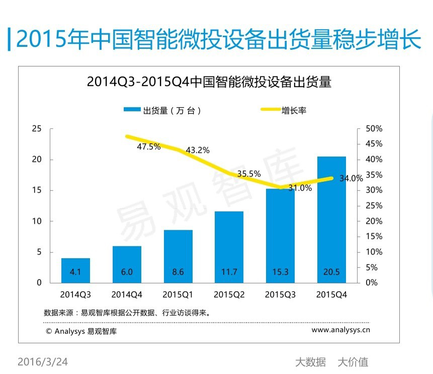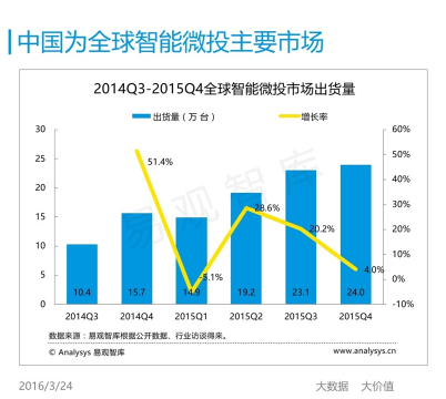 查看详情>>进入2015年以来,,,,中国智能微投设备市场季度出货量环比增长率稳定在30%-45%之间,,,在2015年第3季度出现最低值,,,,为31%。。。